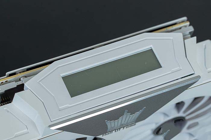 在顯卡的頂部有“GeForce RTX”的字樣,右邊就是第二代HOF Panel顯示屏。除了能夠顯示監控信息外,還能夠自定義文字和上傳圖片。而這塊顯示屏是有上蓋的,可以拆卸。記得包裝中的“王冠”嗎,那個王冠就可以安裝在這里。