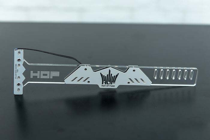 HOF顯卡支架,支持RGB燈光,考慮到在安裝風冷時整張顯卡重量達到了1.43千克,所以顯卡支架這樣的配件也是很有必要的