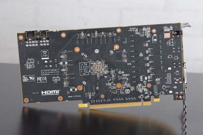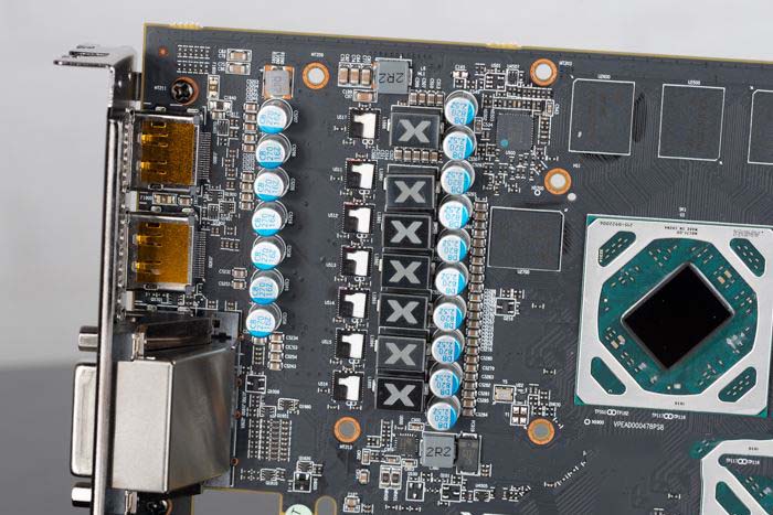 至于顯卡的PCB就和RX 590黑狼是完全一樣的,主要的6+1相供電位于顯卡的左側,供電的用料還是相當不錯的,背部沒有太多的原件。