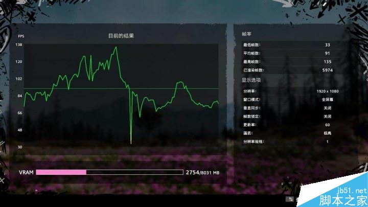 性能測試最高幀數135,最低幀數33,平均幀數91。