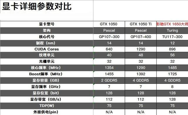 我們先來看一下顯卡的參數對比,對比項我選擇了同級別的它的前輩:GTX 1050和GTX 1050 Ti。
