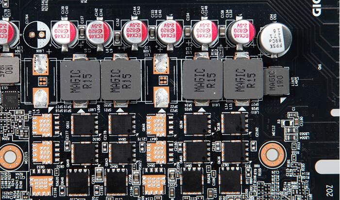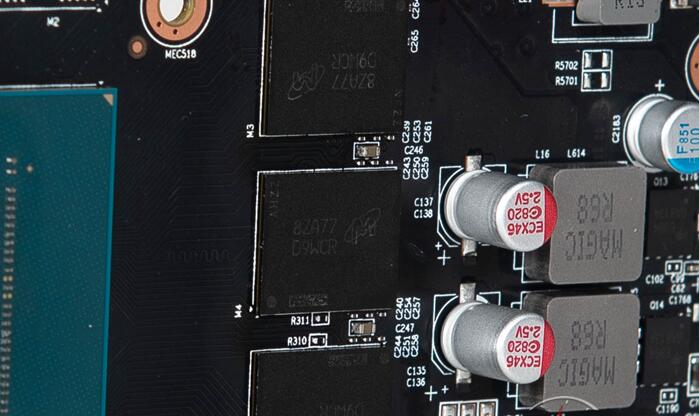 顯存采用了鎂光的GDDR6,單顆規(guī)格為1GB/32bit,總共六顆組成6GB/192bit規(guī)格。顯存上面覆蓋了導熱貼來幫助散熱。