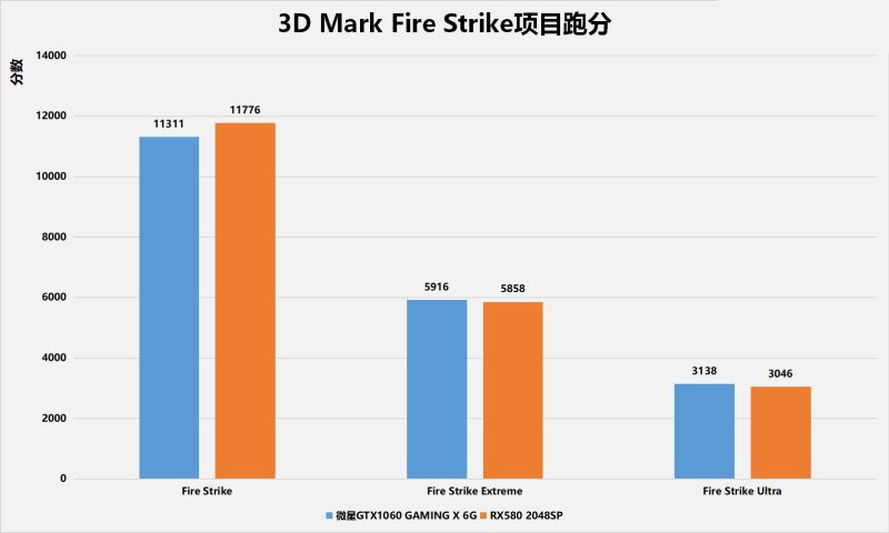 三個常規的Fire Strike項目,Fire Strike上GTX 1066跑出了11311分,最嚴苛的Fire Strike Ultra也有3138分。RX580 2048SP方面除了Fire Strike項目RX580 2048SP得分領先于GTX 1066之外剩下兩個更嚴苛的項目均不敵GTX 1066。