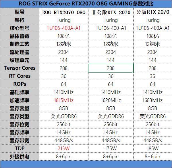 從參數上來看,ROG STRIX GeForce RTX2070 O8G GAMING擁有2304個CUDA單元、64個ROPs、144個TMUs單元。與公版最大的不同就是ROG RTX2070加速頻率達到了1815MHz,比標準的非公版高了195MHz,比公版要高130MHz。215W的TDP也比公版要高30W,可以保障核心有足夠的功率支持。