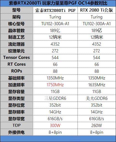 在參數(shù)規(guī)格上,索泰RTX2080Ti PGF OC14與公版大致相同,只是在Boost頻率上做了一些提升,從公版的1635MHz提升到了1750MHz,另外TDP也拉高到了300W,可以在GPU高負載時提供充足的功率用以維持穩(wěn)定的運行頻率。