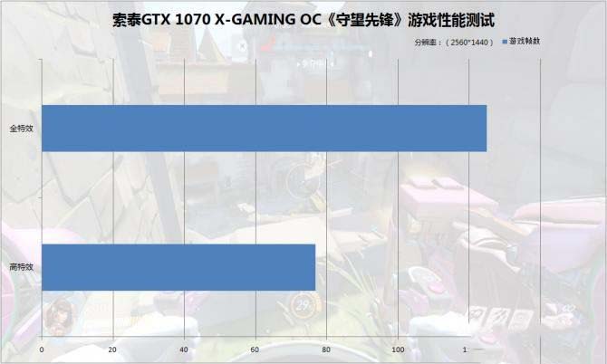 接下來我們測(cè)試的是前年的熱門游戲《守望先鋒》。雖然OW的熱度在國內(nèi)已有所褪去,但仍存在不少玩家,北美的OWL聯(lián)賽也是搞的風(fēng)生水起。《守望先鋒》對(duì)電腦的配置要求更高一些,在2K、144Hz顯示器下,GTX1070以全特效運(yùn)行游戲的FPS為77,運(yùn)行比較流暢。如果把畫質(zhì)調(diào)為高,F(xiàn)PS能有較大提升,達(dá)到125,基本能夠滿足玩家的需求。