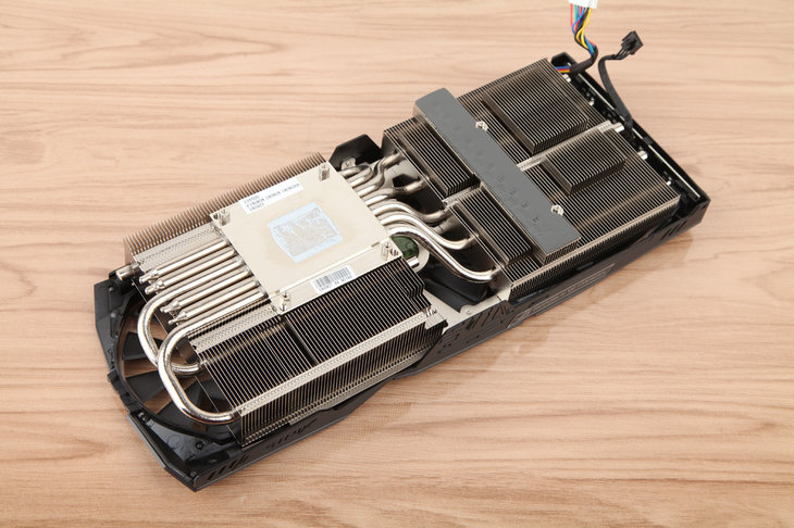 拆開散熱器我們可以發現這是一款規格極其奢華的散熱器產品,不僅擁有了規模龐大的散熱鰭片,還使用了大鏡面純銅底座+6熱管的超豪華散熱配置。整體來看與前一代的GTX 1080Ti所使用的散熱器相當接近。