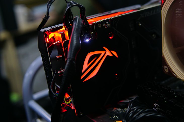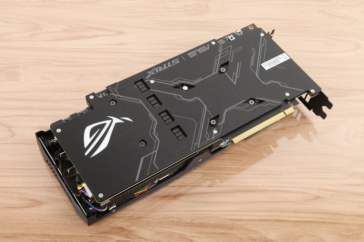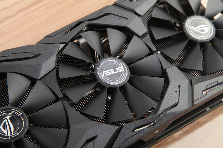外觀上采用了STRIX系列標準的設計語言,棱角分明的純黑色三風扇散熱器外殼辨識度極高,散熱器正面分布著兩排可以支持AURA燈光同步的RGB信仰燈。可以通過官方提供的AURA軟件進行燈光動態和顏色的調節。