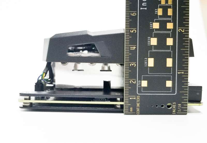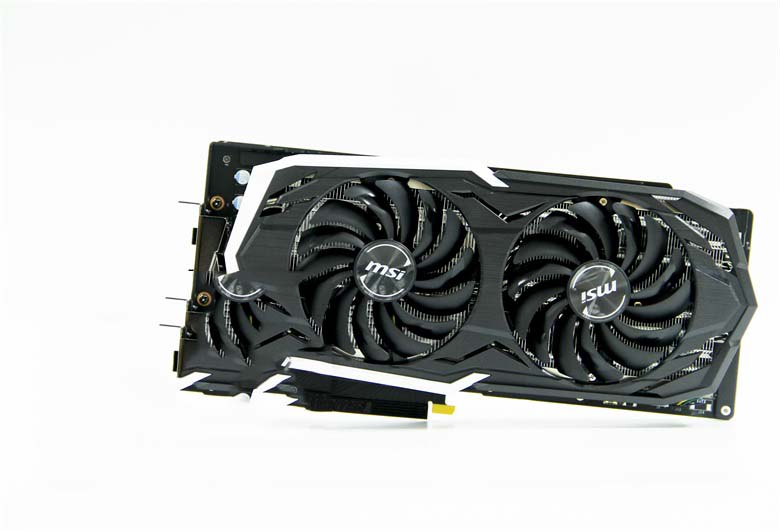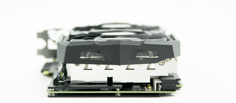 首先來看看顯卡的外觀,正面部分采用整體黑色加白色線條點綴的配色。整體顏色上比較低調,但是正面外殼棱角分明,基本上都采用了硬線條處理,也符合裝甲師這個稱號。RTX 2070 ARMOR 8G裝甲師采用的是大尺寸雙風扇設計,長寬高為330mm×155mm×50mm,長度相比一般三風扇的顯卡會短一些,不過高度相比某些小尺寸散熱風扇的顯卡要高,除了個別小鋼炮機箱安裝可能會出現問題之外在主流機箱中安裝可以說是隨心所欲了。