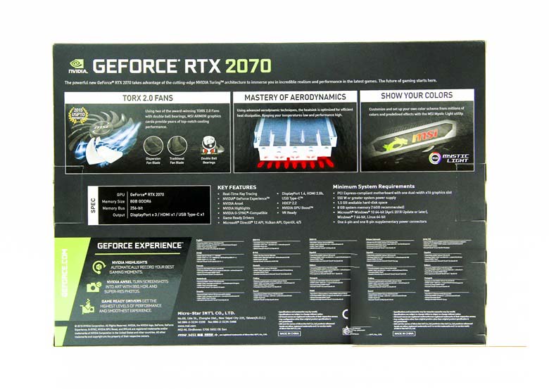 包裝背面列出了顯卡的主要特色,微星這張RTX 2070 ARMOR 8G裝甲師主打的就是牛逼的散熱模塊,從風扇到顯卡內部導熱微星都花了很多精力去改良,比如氣流導向技術和刀鋒4風扇等等。
