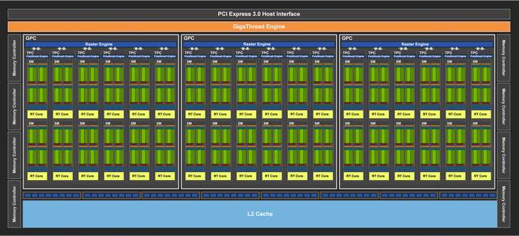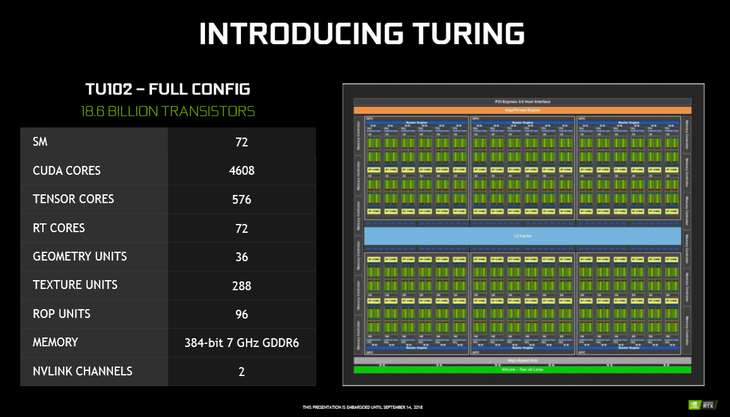 通過上面兩張圖可以看出來,RTX 2070所使用的TU106顯示核心事實上是在完整TU102的基礎上減半的結果,僅有36個SM單元,除顯存位寬外幾乎所有的規格都是TU102核心的一半。這與Pascal架構的GTX 1070所所使用的GP104為GP102一般的策略保持一致。