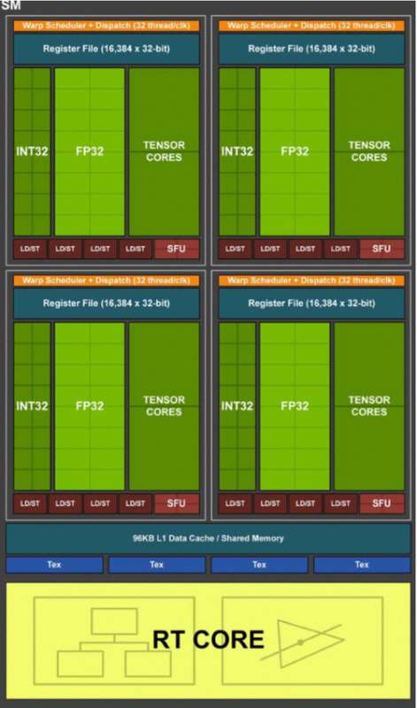 每一組SM單元中都配備了一個RT Core,以及兩兩成對的TENSOR Cores。可以看出,至少表面上來看上這一代FP32和INT32單元所占據的晶體管比例其實相對不那么高。從底層來看,這的確是近12年來GPU核心架構變化最大的一代產品。