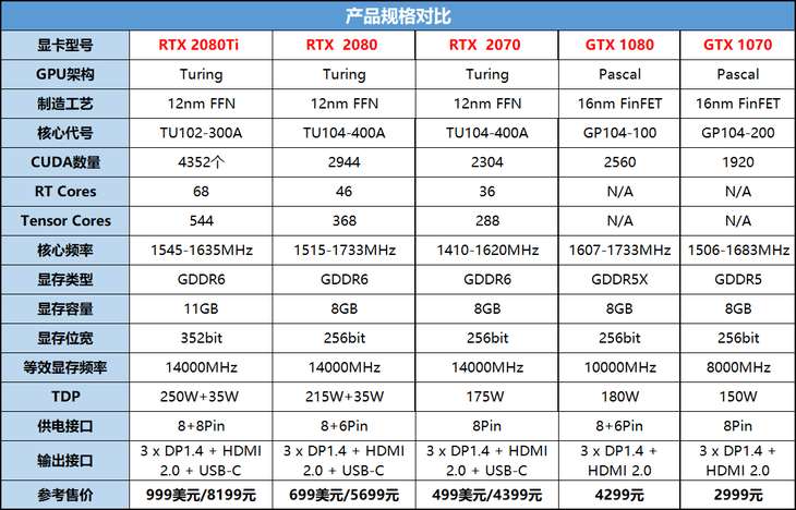 RTX 2070使用12nm工藝制造的TU104-350 GPU核心,共2304個CUDA單元,約為RTX 2080Ti的53%。負責光線追蹤的RT Cores 達到36個,負責DLSS計算的Tenser Cores達到 288個。顯存方面使用了與RTX 2080相同的8GB GDDR6顯存,等效頻率達到14000MHZ,位寬256bit,耕升RTX 2070炫光的標準Boost頻率達到1620MHz。TDP方面則只有175W。當然售價方面相比RTX 2080Ti和RTX 2080而言也要親民許多。
