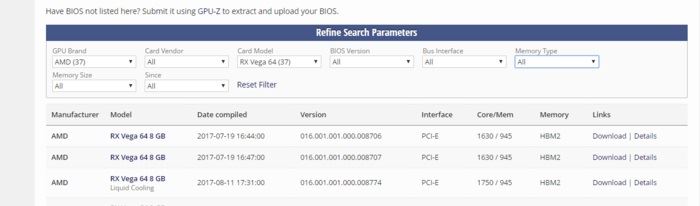 然后點擊后面的Details可以查看BIOS具體細節,在BIOS中我們赫然發現BIOS的顯存是三星的。其實大部分RX VEGA 64顯卡的BIOS顯存設定都是三星的,皆因三星顯存體質較好,能穩定在較高的頻率。然后我們下載BIOS,先放一邊。