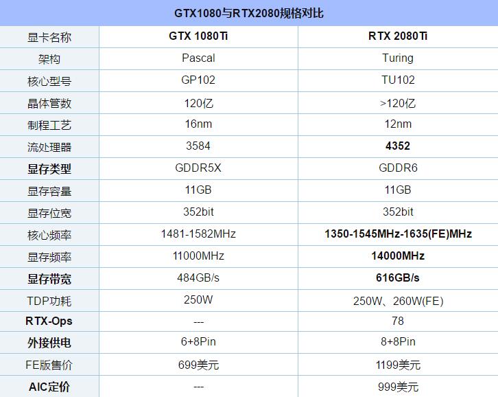 由于新顯卡尚未解禁,所以暫時(shí)無(wú)法得到具體的性能測(cè)試數(shù)據(jù),我們暫時(shí)只能通過參數(shù)規(guī)格來(lái)簡(jiǎn)單對(duì)比以下。下面制作了一張?jiān)敿?xì)的RTX2080Ti和GTX1080Ti參數(shù)對(duì)比,區(qū)別如下: