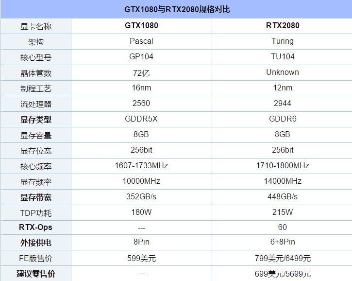 由于新顯卡尚未解禁,所以暫時無法得到具體的性能測試數據,我們暫時只能通過參數規格來簡單對比以下。下面制作了一張詳細的GTX1080與RTX2080參數對比,區別如下:
