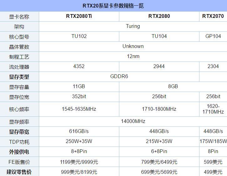 大家都知道,2018年8月20日24點(diǎn),NVIDIA在德國科隆國際游戲展上舉辦了GeForce Gaming Event展前發(fā)布會(huì),正式發(fā)布全新一代的GeForce 20系列游戲顯卡,發(fā)布會(huì)帶來了顯卡一共有三款,分別是RTX2070/2080/2080Ti,由于采用了全新的圖靈構(gòu)架,所以在命名方式有所改變,目前GTX2080/2080Ti國行版已經(jīng)開啟了預(yù)約,9月中下旬上市。下面小編為大家?guī)砹薘TX2070/2080/2080Ti規(guī)格參數(shù)一覽,想了解的朋友千萬不要錯(cuò)過了。
