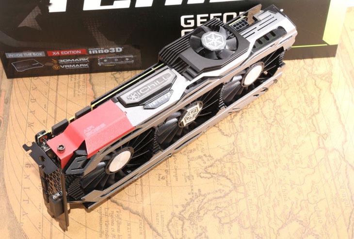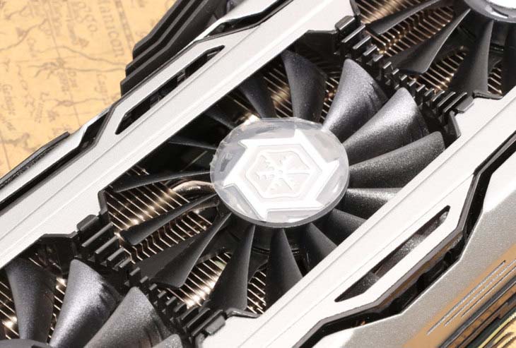 映眾(Inno3D)GTX 1080冰龍超級版采用的是第五代全新HerculeZ X4 Air Boss散熱器,其延續了上一代散熱器的供電模塊散熱系統,巨大的散熱片緊貼顯卡的供電部分,通過兩根復合熱管(上一代為一根熱管),導向顯卡頂端,通過設置在顯卡頂上的第四個風扇將熱量散出。