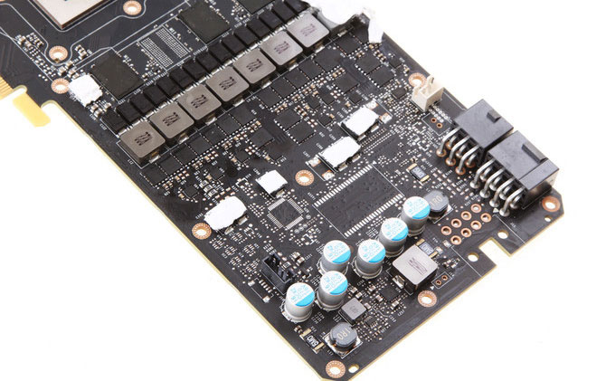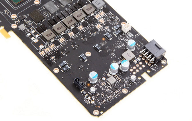 再來(lái)看PCB,無(wú)論是正面還是背面,GTX 1080 Ti的PCB給人的第一感覺(jué)就是“密”:顯存顆粒由GTX 1080的8顆增加到11顆,供電相數(shù)由GTX 1080的5+1增加到7+2,MOSFET、電容、電感數(shù)量也相應(yīng)增加。