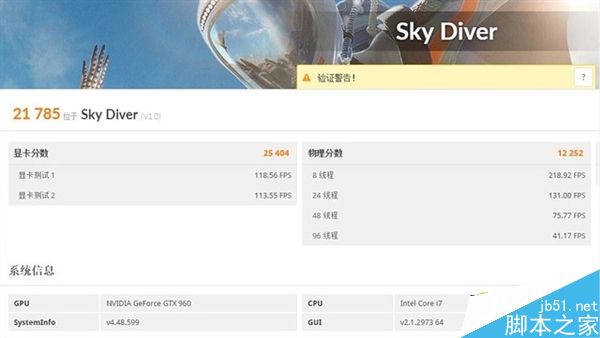 在3D Mark測試中,我們使用Sky Diver進行性能測試。250元顯卡的顯卡分數為5760分,而七彩虹的顯卡則達到了25404分,同樣有著明顯的差距。雖然從跑分上看不出來這是什么顯卡,不過可以肯定這塊顯卡一定不是GTX 960,只是商家手動刷了BIOS騙過了識別軟件。