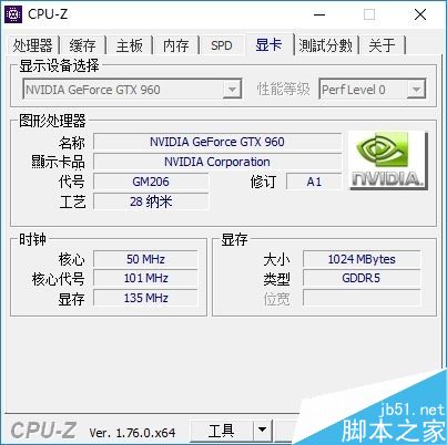 CPU-Z的硬件檢測為GTX 960顯卡,顯存為1GD5。
