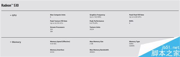規(guī)格方面,Radeon 530擁有最多6組CU單元,流處理器有320個(gè)和384個(gè)兩個(gè)版本,紋理單元?jiǎng)t是20/24個(gè),光柵單元為8個(gè),默認(rèn)頻率1024MHz,浮點(diǎn)性能0.8TFLOPS,配備DDR3或者GDDR5顯存,位寬64bit,容量1-2GB,最高帶寬48GB/s。