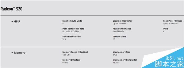 Radeon 520擁有最多5組CU單元,320個(gè)流處理器單元,4組ROP單元,20個(gè)紋理單元,頻率可達(dá)1030MHz,浮點(diǎn)性能0.66TFLOPS。搭配的顯存是GDDR5,位寬64bit,頻率4.5GHz,容量最高2GB,帶寬最高48GB/s。