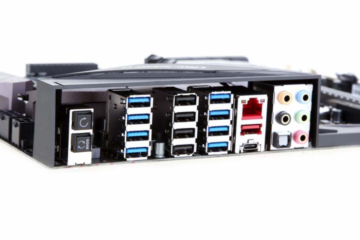 背部I/O接口部分提供了1個清除 CMOS 按鈕、1個USB BIOS Flashback 按鈕、8個USB 3.0 接口、4個USB 2.0接口、1個USB 3.1Type-C接口、1個USB 3.1Type-A接口、1個RJ45網絡接口、5個3.5mm音頻接口和1個光纖S/PDIF數字音頻輸出接口。