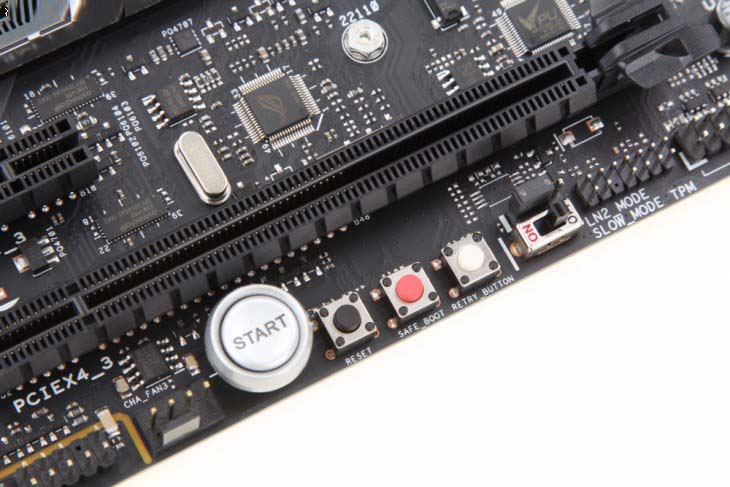 ROG高端主板上標配的開始和重啟按鍵、Safe Boot Button、ReTry Button、Slow Mode開關,乃至為了極限超頻準備的LN2開關,在C6H上一應俱全。