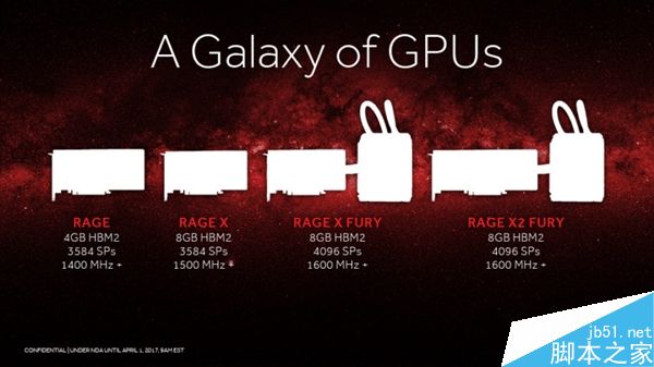 最終,AMD RX Vega的家族陣營將包括RAGE、RAGE X、RAGE X Fury、RAGE X2 Fury四款,參數(shù)依次提升。