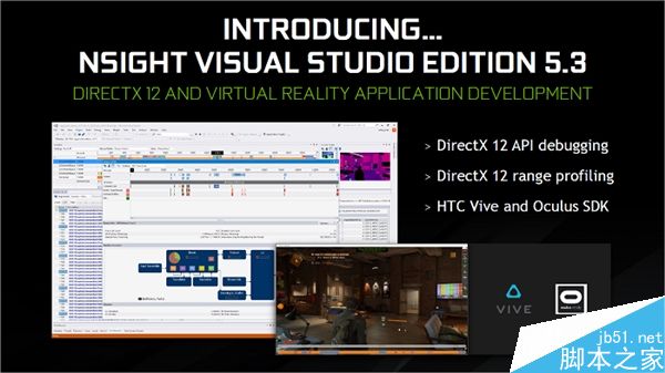 另外,NVIDIA還宣布了GameWorks DX12項目,引入了Aftermath 1.0、Nsight Visual Studio Edition 5.3兩套工具,前者主要用于診斷和分析以更好的理解性能,而后者主要用戶實時調試,支持Oculus Rift、SteamVR。