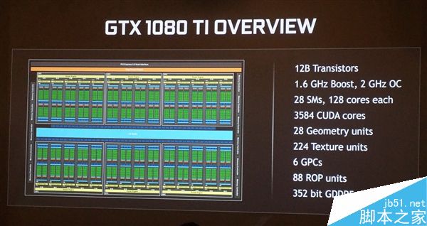 GTX 1080 Ti顯卡基于16nm GP102核心,擁有多達3584個流處理器(28組SM單元)、28個幾何單元、224個紋理單元、88個ROP單元,核心加速頻率1.6GHz,超頻可達2GHz。