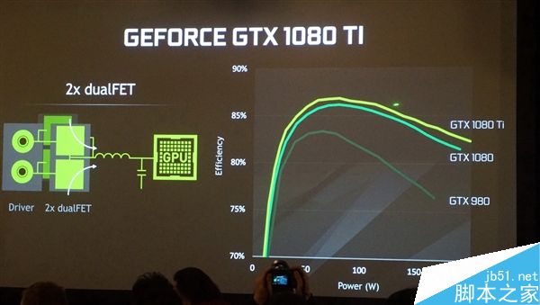 供電方面,GTX 1080 Ti采用了新的七相雙FET設計,總計14個雙FET,最大供電電流高達250A,供電效率相比GTX 1080進一步提升。