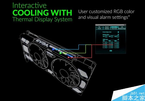 RGB信仰燈怎么能少?頂部的“EVGA GeForce GTX 1080 FTW2”這樣的型號標(biāo)識都可以閃閃發(fā)亮,而且有三個狀態(tài)指示燈來顯示溫度狀況:藍(lán)色低溫、綠色正常、紅色高溫。