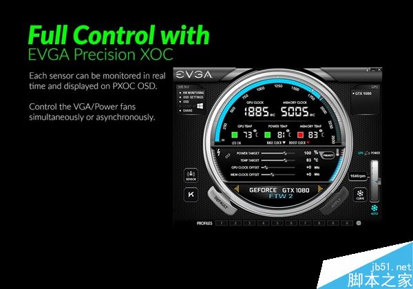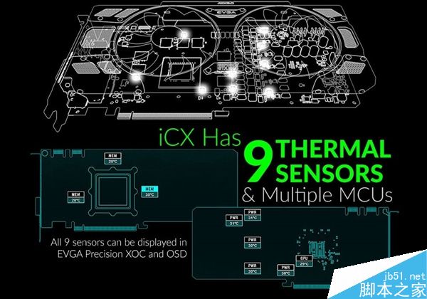 EVGA iCX最大的特點就是通過在PCB上植入了多達(dá)9個溫度傳感器,其中正面3個、背面6個,再配合多個MCU(微控制器),可實時監(jiān)測顯卡核心、供電、顯存的溫度狀態(tài),并在EVGAPricision XOC、OSD工具中顯示。