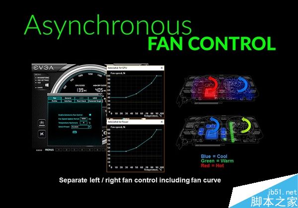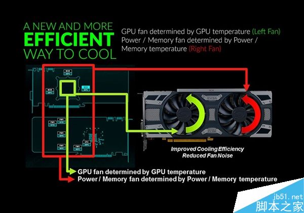 兩個風(fēng)扇不但造型重新設(shè)計,還支持異步運行,可分別根據(jù)GPU核心溫度、供電區(qū)域/顯存溫度運轉(zhuǎn)在不同的速度上,可提高散熱效率并降低噪音。