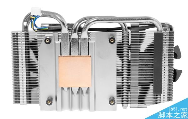 類似公版的4+1相供電和8針供電接口,固態(tài)電感,MOSFET獨(dú)立散熱片,搭配純銅底座、三條鍍鎳熱管、大面積鋁質(zhì)鰭片、雙風(fēng)扇、金屬護(hù)罩的散熱器,總長(zhǎng)度195毫米,PCB本身也有181毫米,略大于Mini-ITX主板的170毫米寬度,所以安裝的時(shí)候需要注意空間分配。
