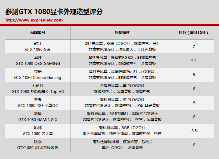 由于這次橫評的是GTX 1080顯卡,我們更多地關注它的性能表現、有何特色。畢竟對于這個價位的顯卡都不是追求極致性價比,更愿意為顯卡特色而埋單,因此本次評分針對過往高端顯卡評分作微小的改動,其標準如下: