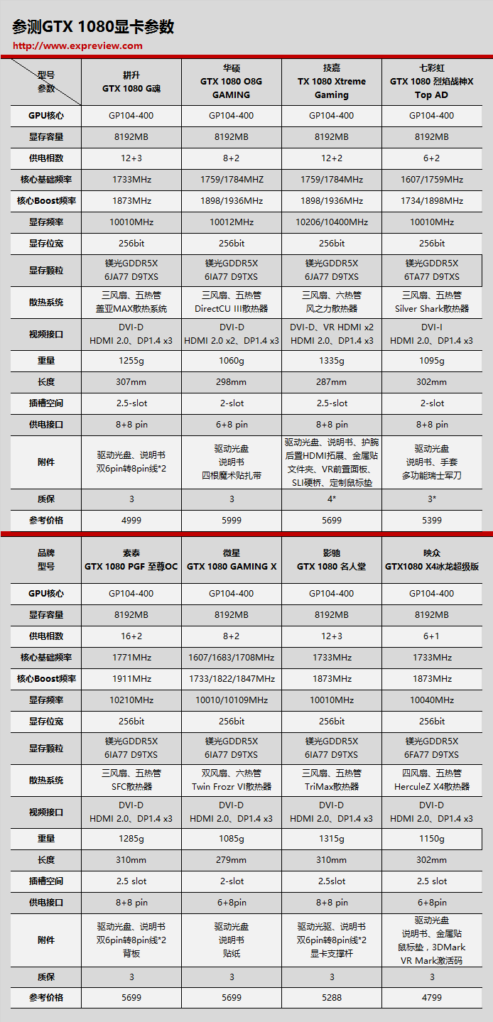本次GTX 1080顯卡測評囊括了市面上我們常見的8個品牌,包括:耕升、華碩、技嘉、七彩虹、索泰、微星、影馳、映眾(排名按拼音首字母排序)。各家都有一款顯卡入選橫評,一共8款顯卡。其詳細規格如下表所示: