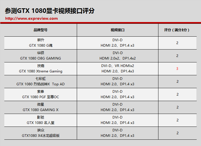 按照公版設計,GTX 1080視頻接口包含一個DL-DVI,一個HDMI 2.0b以及三個DisplayPort1.4接口。雖然說3種不同的視頻輸出接口已經滿足大部分人需求,但是以GTX 1080的性能水準,已經達到VR Ready的高性能需求,如果使用例如HTC VIVE頭戴式VR顯示器,額外更多的HDMI接口使用起來也就更得心應手。因此本環節采用扣分制度,采用VR友好型HDMI接口的將獲得滿分,沒有的扣1分。