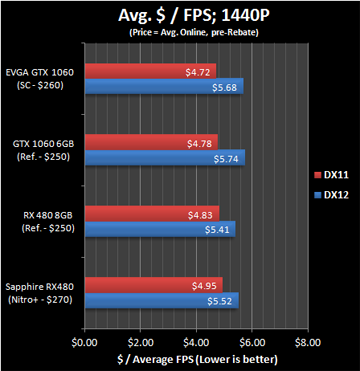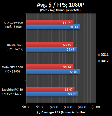 RX 480 8GB與GTX 1060 6GB國(guó)內(nèi)外的報(bào)價(jià)都差不多是同一水平,人民幣價(jià)格多在1999-2199元之間,RX 480總體便宜一點(diǎn)(這幾天看到過(guò)XFX RX 480 8GB做到1699元的價(jià)格),不過(guò)高價(jià)的GTX 1060 6GB顯卡頻率也提升了不少。如果硬要在這兩個(gè)之間選擇一款的話,原文的推薦是RX 480 8GB,不僅是因?yàn)锳MD縮小了與GTX 1060顯卡的性能差距,它在DX12下也有優(yōu)勢(shì)。