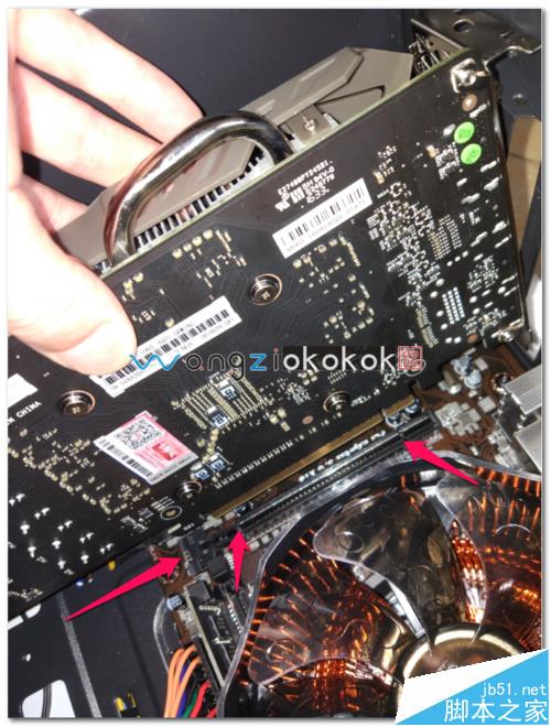 3、把顯卡的卡口對準主板的顯卡槽卡口——后面的塑料卡扣打開,垂直插下用力要均勻。如圖