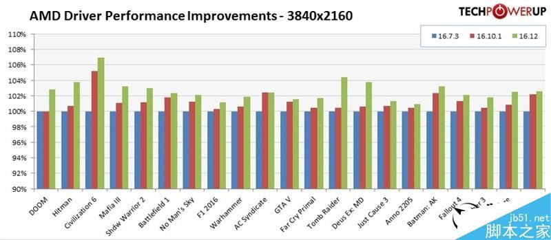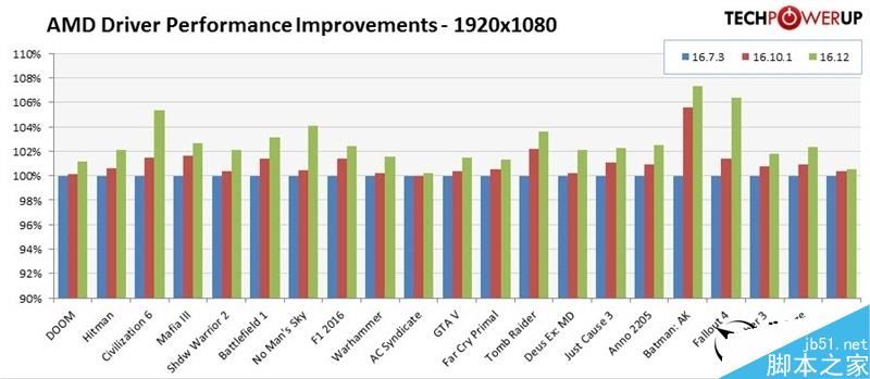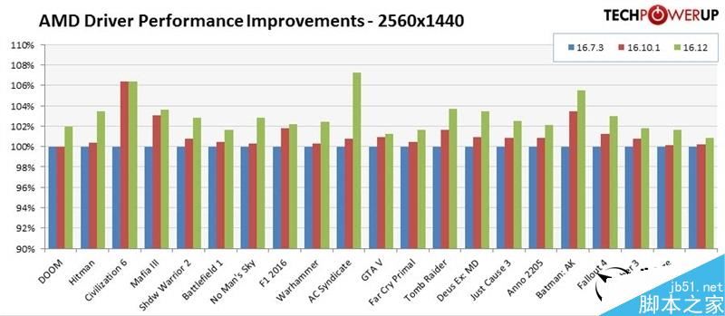 1440P下,最高幅度是《奇點灰燼》的7%左右(相對16.10.1),最低的如《GTA 5》也有0.3%左右(TPU這個表很心機啊……)。