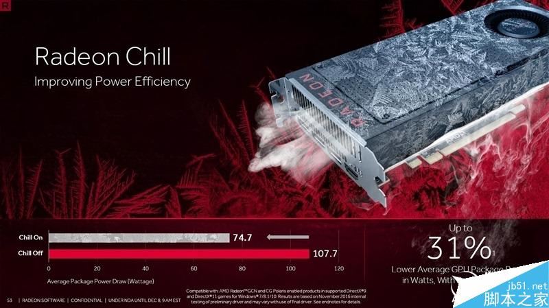 Radeon Chill,來自于AMD收購的HiAlgo三大技術之一,一款高效幀率控制器,可根據鼠標移動速度動態調節顯卡幀率,旨在降低系統功耗,同時讓最終用戶持續獲得最佳游戲體驗,實現平滑游戲而不會對性能產生顯著影響,為用戶帶來更涼爽更安靜系統。