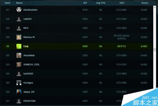 縱向對比,這塊型號為687F:C1(接近RX 480,顯存不足4G)的神秘卡得分8400,平均幀85FPS,完全處于GTX 1080梯隊,看齊R9 290雙卡CF。