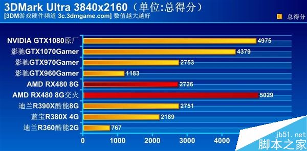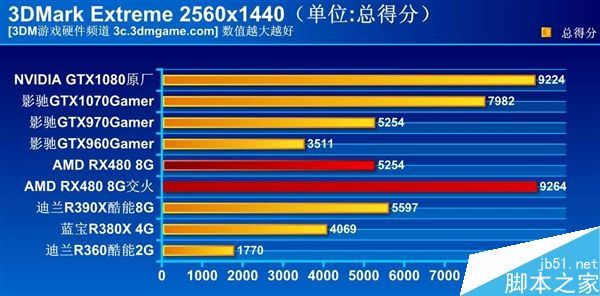筆者在網上查閱了部分硬件媒體對RX 480/RX 480 CF/GTX 1080的測試成績(因為測試平臺不同,且下圖更像是綜合得分非GPU單項,故僅供參考)——