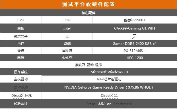 為保證測試能夠發(fā)揮顯卡的最佳性能,本次測試平臺采用最強酷睿芯——Intel酷睿i7-5960X處理器、技嘉X99芯片組主板、影馳 Gamer DDR4-2400 8GB 四通道內存、安鈦克1200w金牌電源組建而成。詳細硬件規(guī)格如下表所示: