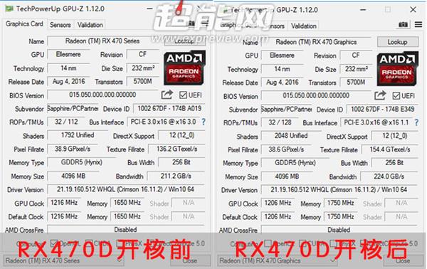 而對于藍寶石RX 470D超白金版,小編是不建議各位嘗試開核的,因為RX 470D超白金版和RX 470超白金版兩者PCB設計上有區別的,而且RX 470超白金版其GPU核心很可能是特挑體質比較好的,其BIOS默認頻率較高,刷到RX 470D超白金版上很可能就會出現GPU不穩定情況,所以開核請慎重。