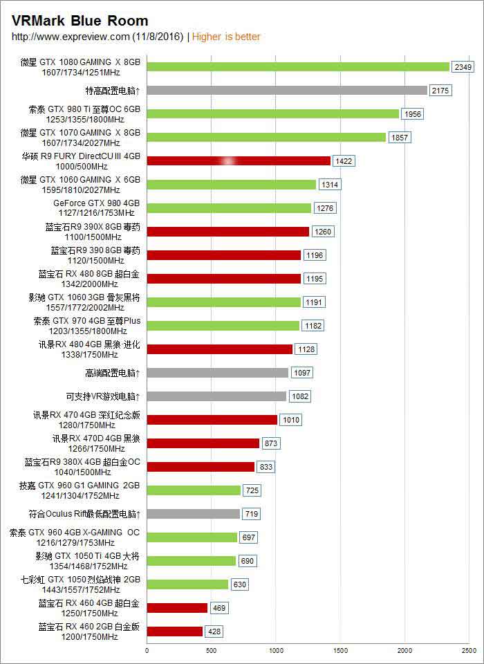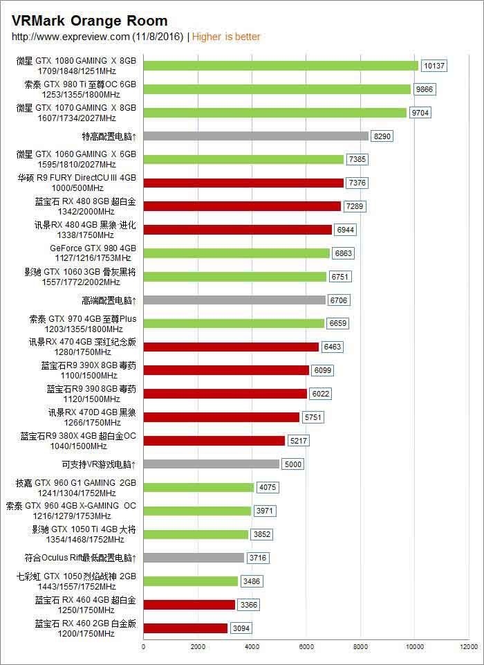 可支持VR游戲電腦與高端配置電腦這兩條線之間的分差太小了,根本沒有顯卡分別在這兩條線之間,感覺這兩條線要重新畫一下才合理,只有GTX 1080一塊顯卡超越了特高配置電腦這一條線,其他的顯卡都在高配置電腦這條線之上,在這個測試里,RX 480 4GB被GTX 970與GTX 1060 3GB超越了,GTX 980的得分比RX 480 8GB還高,R9 390、R9 390X的得分則會到正常水平略高于RX 480 8GB,R9 FURY的得分也超越了GTX 1060 6GB。