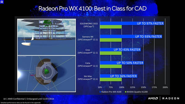 Radeon Pro WX 4100的核心換成了Polaris 11,但不像桌面版RX 460有所保留,它開啟了全部1024個流處理器,核心頻率約1.17GHz,單精度浮點性能2.4TFlops,功耗低于50W,半高式設計,號稱最快的半高式工作站顯卡。